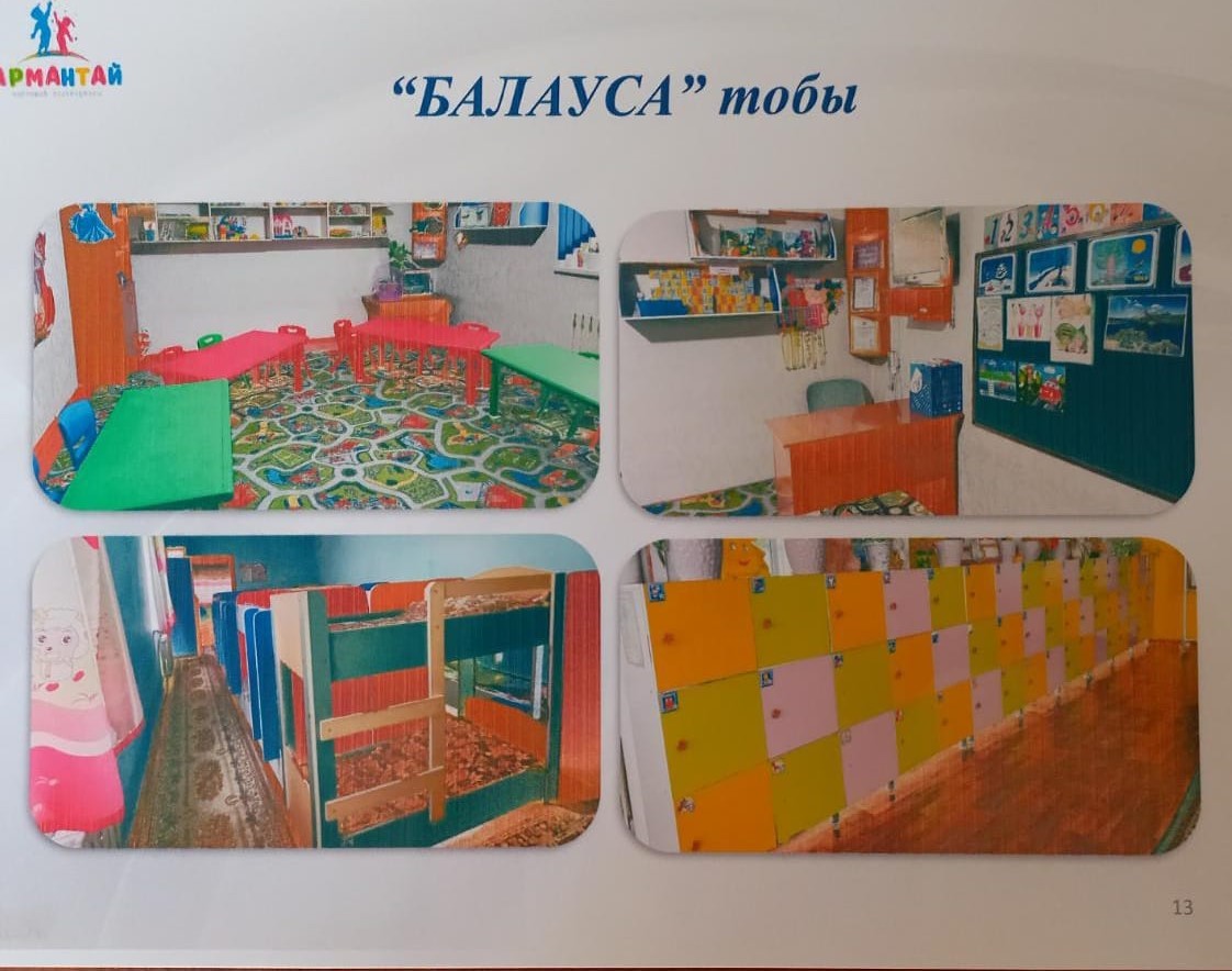 Әрбір топта жеке жатын, ойын, әжетхана және ас тарқататын бөлмелері бар.