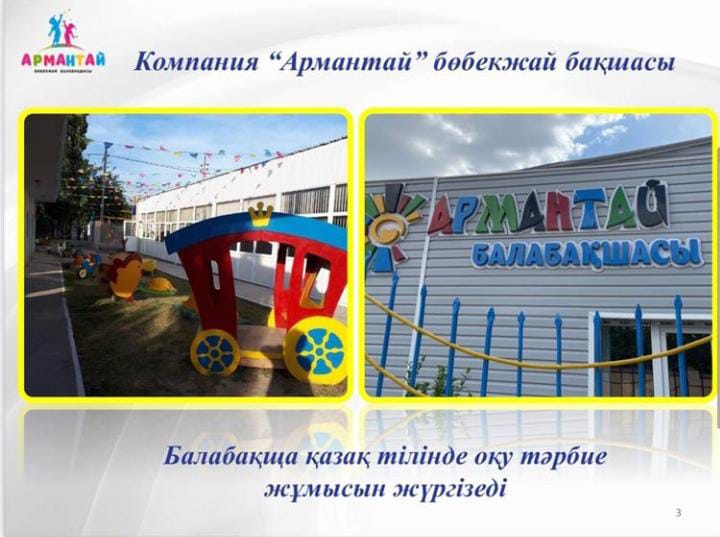 Осыған орай, Шымкент қаласының Еңбекші ауданына қарасты, «Мирас» ықшам ауданындағы Маусым көшесінде, жер аумағы 0,8га құрайтын, «Компания Армантай» бөбекжай бақшасы жауапкершілігі шектеулі серіктестігі 2011 жылы ашылды.