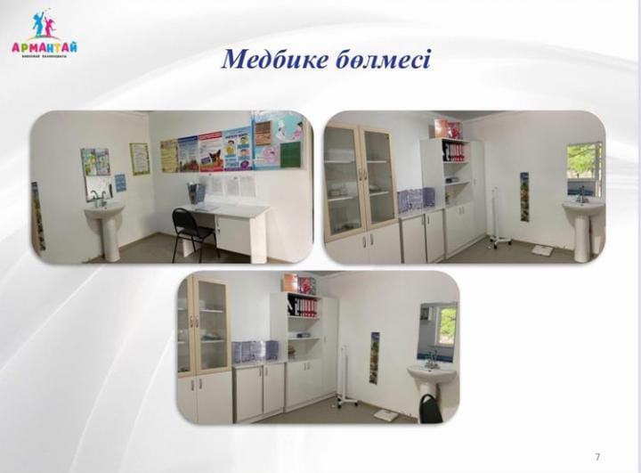 Егу және оқшаулау бөлмелерден тұратын төлқұжаттандырылған медициналық кабинетпен қамтылған. Бөбекжай –бақшада жалпы 15 бейне камералар орнатылған, оның 10 данасы мекеме ішіне, 5 данасы мекеменің сыртына орналастырылған.